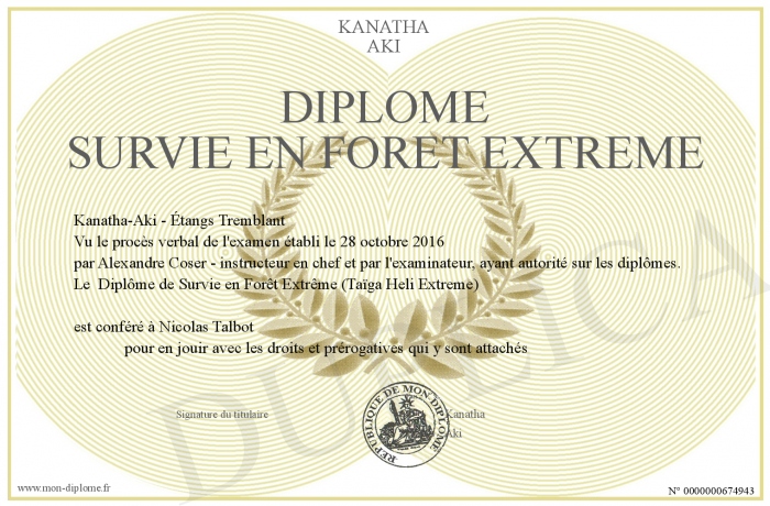 Envoyez par email votre Diplome Survie en Foret Extreme personalisé