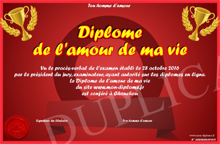 Envoyez par email votre Diplôme de l'amour de ma vie personalisé