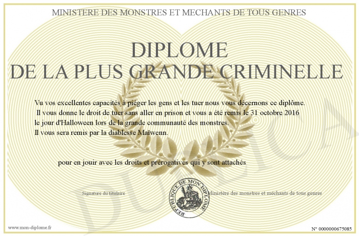 Envoyez par email votre Diplôme de la plus grande criminelle personalisé