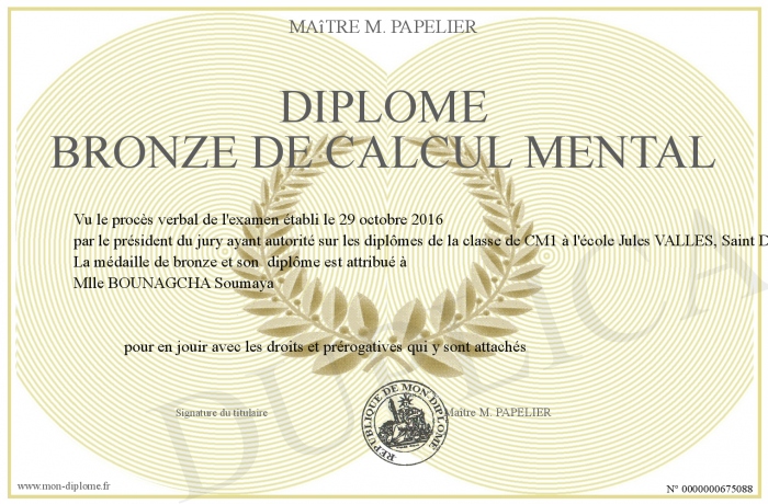 Envoyez par email votre Diplôme bronze de calcul mental personalisé