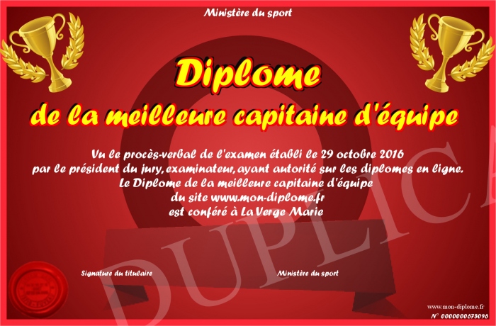 Envoyez par email votre Diplôme de la meilleure capitaine d'équipe personalisé