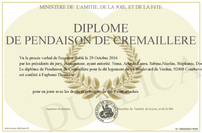 Envoyez par email votre Diplôme de Pendaison de Crémaillère personalisé