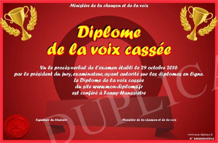 Envoyez par email votre Diplôme de la voix cassée personalisé