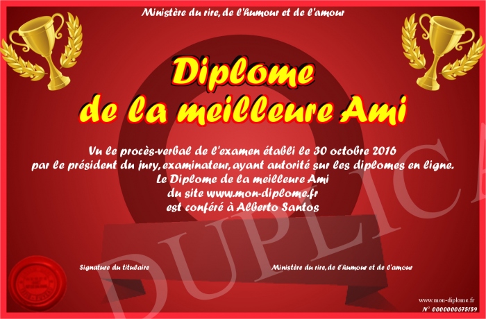 Envoyez par email votre Diplome de la meilleure Ami personalisé