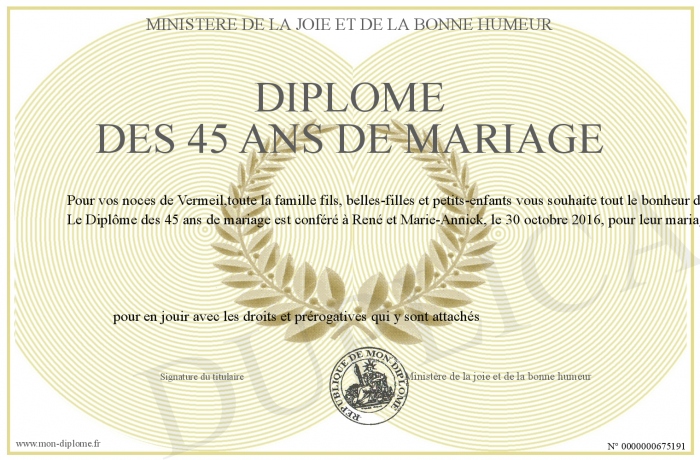 Envoyez par email votre Diplome des 45 ans de mariage personalisé