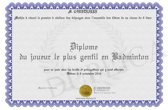 Envoyez par email votre Diplôme du joueur le plus gentil en Badminton personalisé
