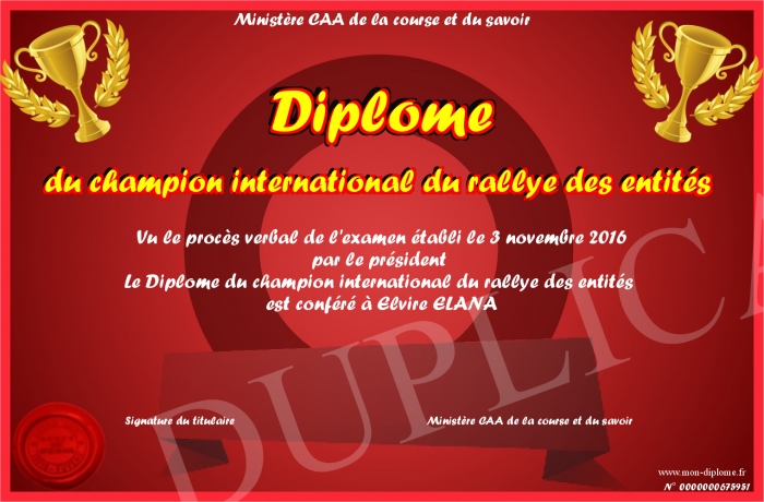Envoyez par email votre Diplôme du champion international du rallye des entités personalisé