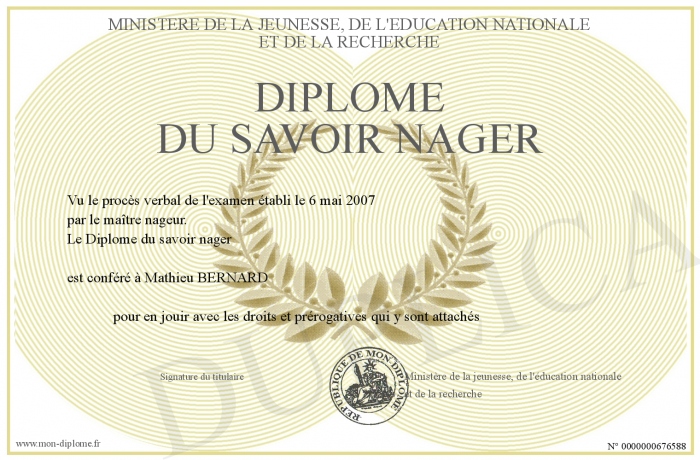 Envoyez par email votre Diplôme du savoir nager personalisé