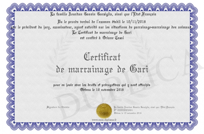 Envoyez par email votre Certificat de marrainage de Gari personalisé
