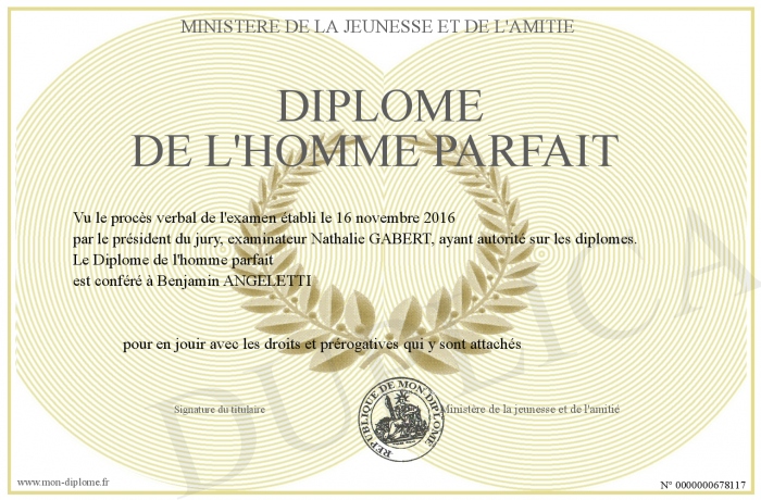 Envoyez par email votre Diplôme de l'homme parfait personalisé