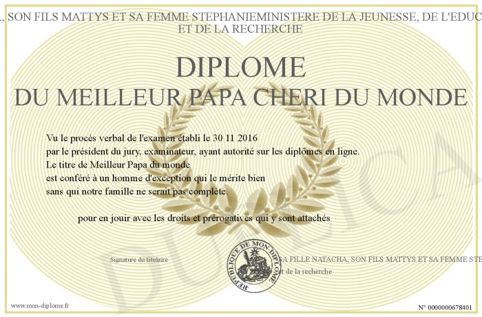 Envoyez par email votre Diplôme du meilleur papa cheri du monde personalisé