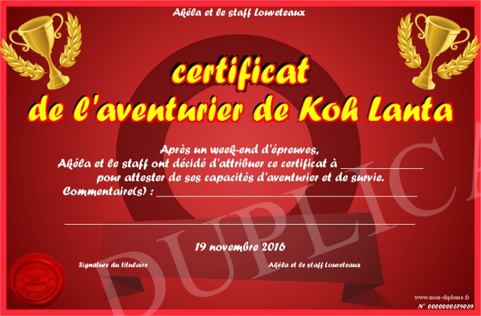 Envoyez par email votre certificat de l'aventurier de Koh Lanta personalisé