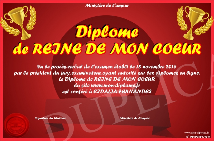 Envoyez par email votre Diplome de REINE DE MON COEUR personalisé