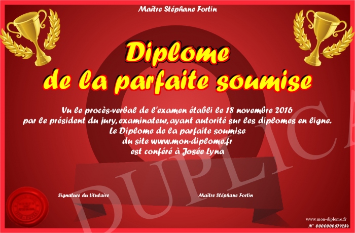 Envoyez par email votre Diplôme de la parfaite soumise personalisé