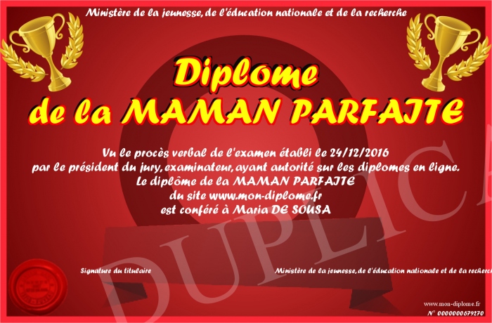 Envoyez par email votre Diplôme de la MAMAN PARFAITE personalisé