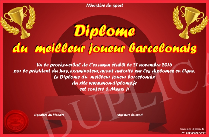 Envoyez par email votre Diplôme du meilleur joueur barcelonais personalisé