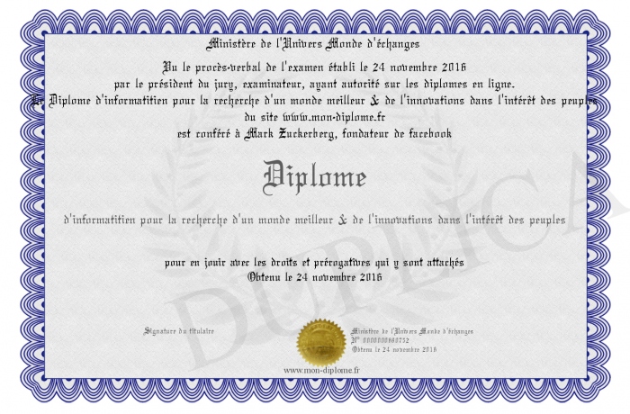 Envoyez par email votre Diplôme d'informatitien pour la recherche d'un monde meilleur & de l'innovations dans l'intérêt des peuples personalisé