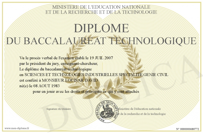 Envoyez par email votre Diplôme du baccalauréat technologique personalisé