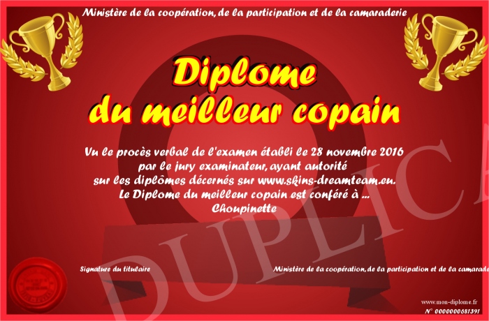 Envoyez par email votre Diplôme du meilleur copain personalisé