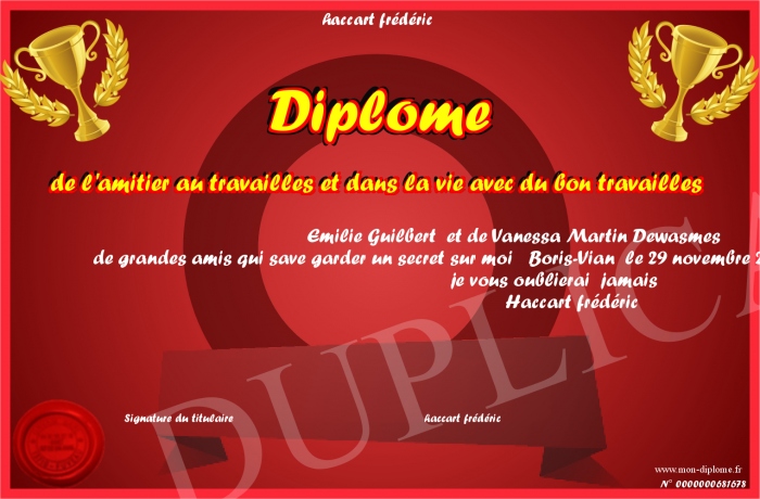 Envoyez par email votre Diplôme de l'amitier au travailles et dans la vie avec du bon travailles personalisé