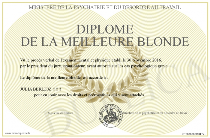 Envoyez par email votre Diplôme de la meilleure blonde personalisé