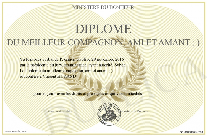 Envoyez par email votre Diplôme du meilleur compagnon, ami et amant ; ) personalisé