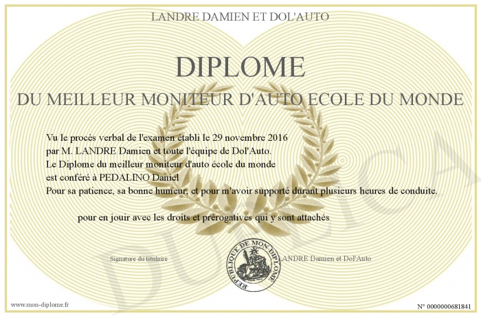 Envoyez par email votre Diplôme du meilleur moniteur d'auto école du monde personalisé