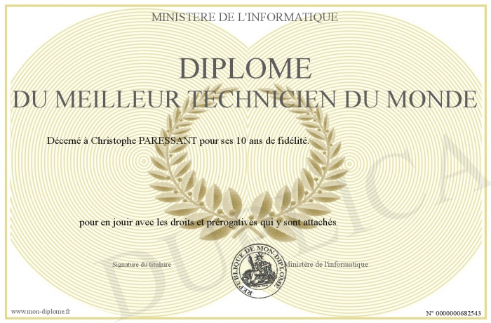Envoyez par email votre Diplôme du meilleur technicien du monde personalisé