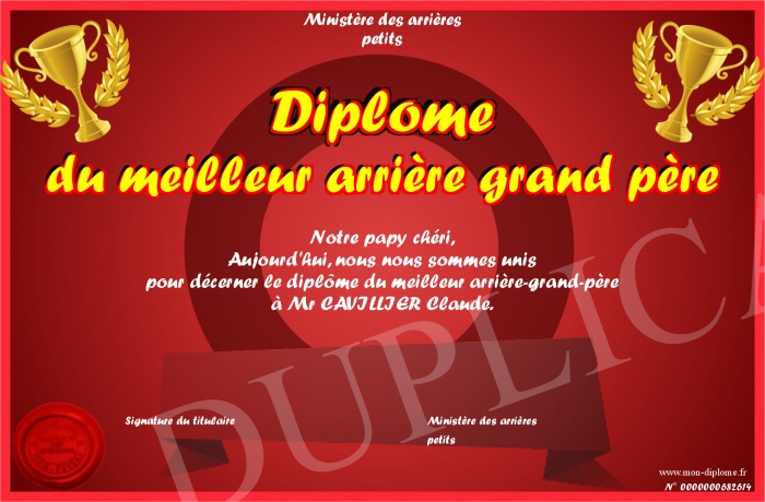 Envoyez par email votre Diplôme du meilleur arrière grand père personalisé