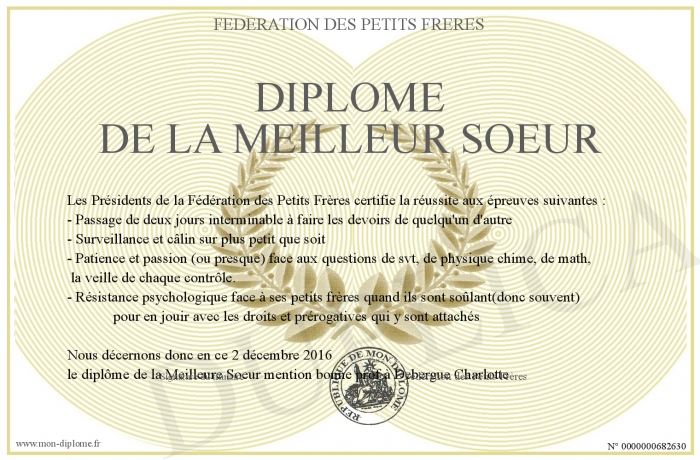 Envoyez par email votre Diplôme de la Meilleur Soeur personalisé