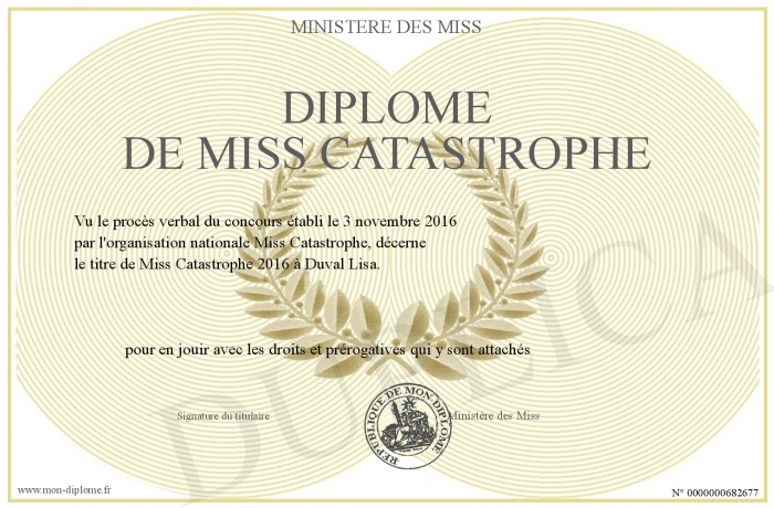 Envoyez par email votre Diplôme de Miss Catastrophe personalisé