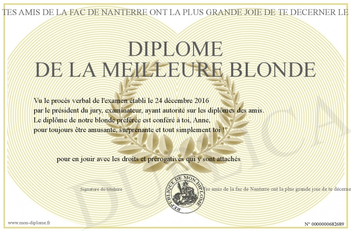 Envoyez par email votre Diplôme de la meilleure blonde personalisé