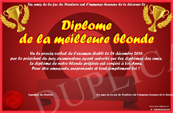 Envoyez par email votre Diplôme de la meilleure blonde personalisé