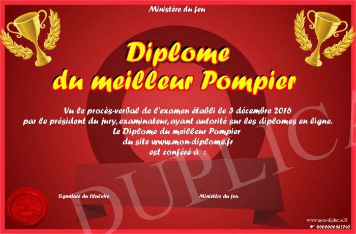 Envoyez par email votre Diplome du meilleur Pompier personalisé