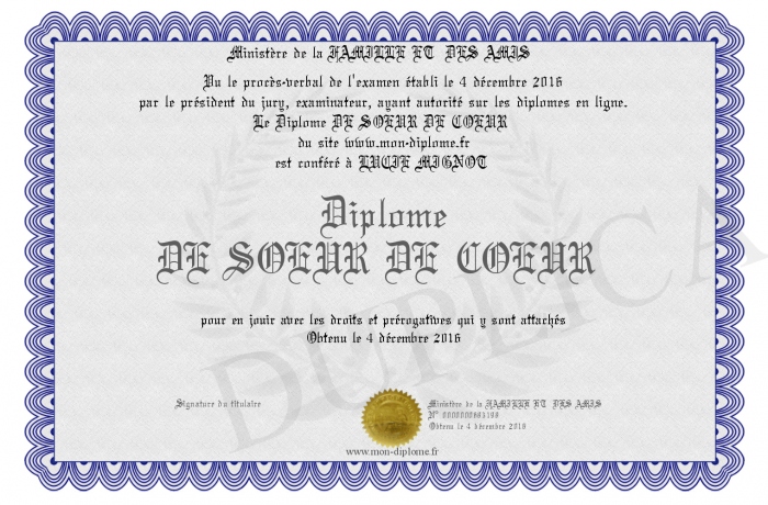 Envoyez par email votre Diplôme DE SOEUR DE COEUR personalisé