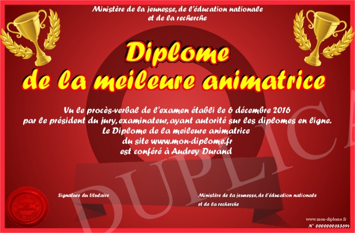 Envoyez par email votre Diplôme de la meileure animatrice personalisé