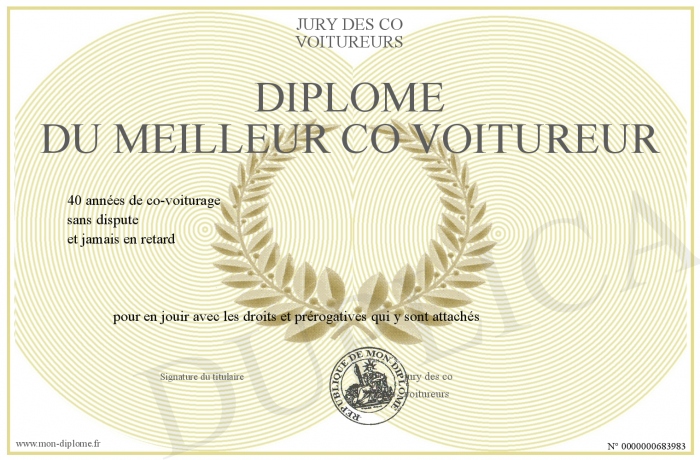 Envoyez par email votre Diplôme du meilleur co voitureur personalisé