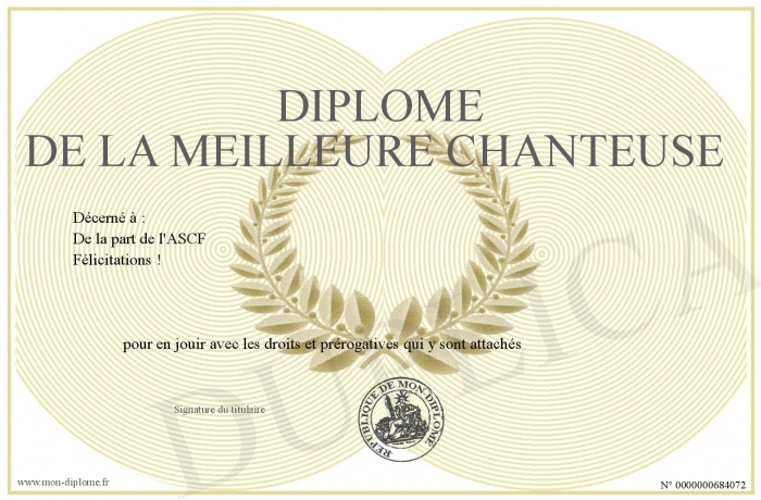 Envoyez par email votre Diplôme de la meilleure chanteuse personalisé