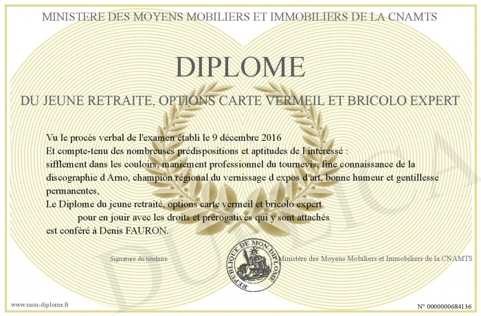 Envoyez par email votre Diplôme du jeune retraité, options carte vermeil et bricolo expert personalisé
