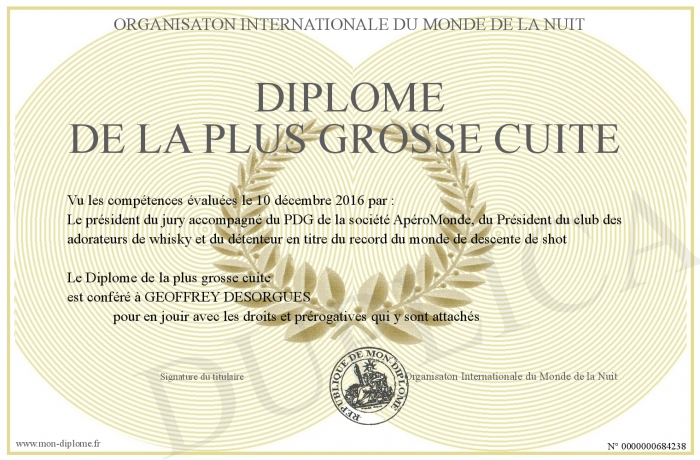Envoyez par email votre Diplôme de la plus grosse cuite personalisé