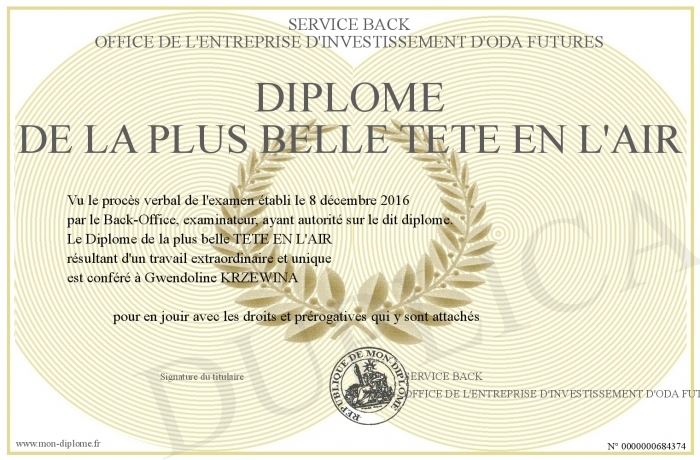 Envoyez par email votre Diplôme de la plus belle TETE EN L'AIR personalisé