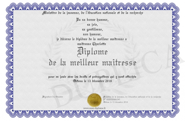 Envoyez par email votre Diplôme de la meilleur maitresse personalisé