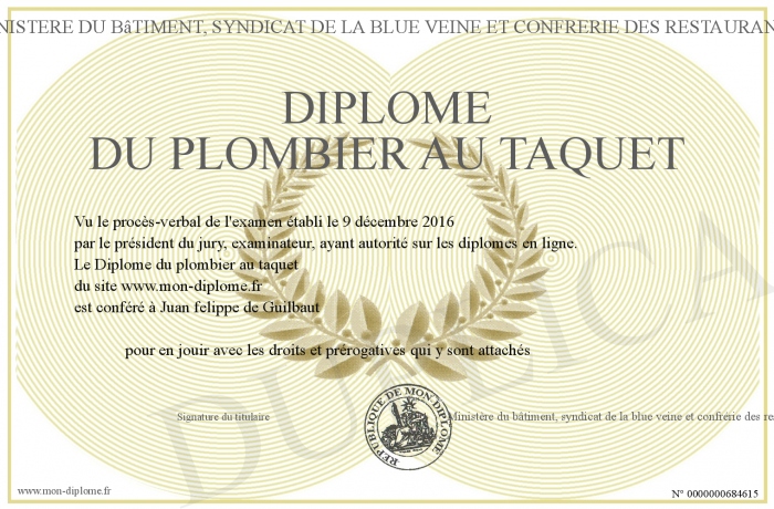 Envoyez par email votre Diplôme du plombier au taquet personalisé