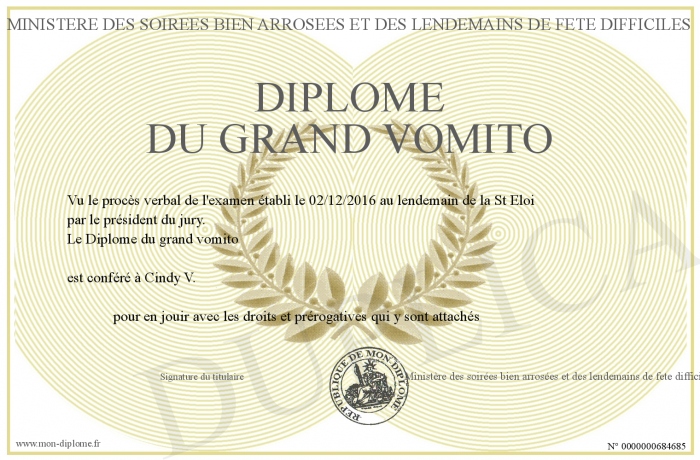 Envoyez par email votre Diplôme du grand vomito personalisé
