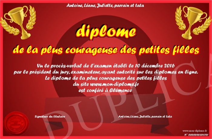 Envoyez par email votre diplôme de la plus courageuse des petites filles personalisé