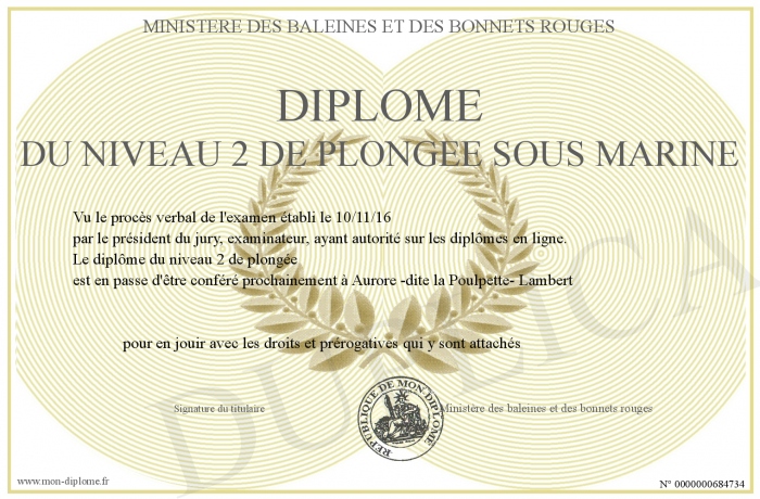 Envoyez par email votre Diplôme du niveau 2 de plongée sous marine personalisé