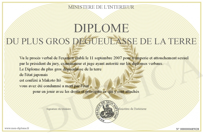 Envoyez par email votre Diplôme du plus gros dégueulasse de la terre personalisé