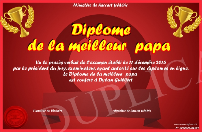 Envoyez par email votre Diplome de la meilleur papa personalisé