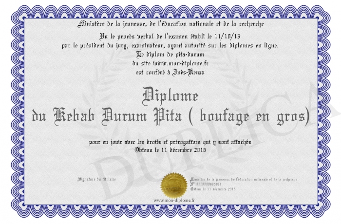 Envoyez par email votre Diplôme du Kebab Durum Pita ( boufage en gros) personalisé