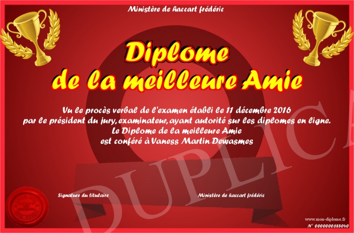 Envoyez par email votre Diplome de la meilleure Amie personalisé